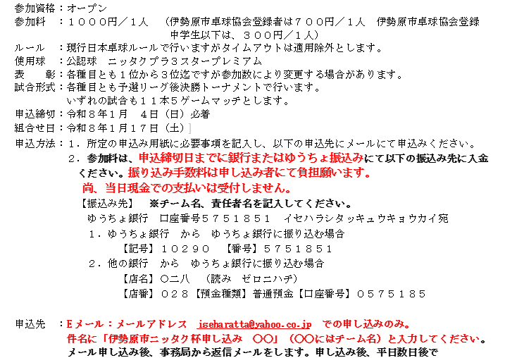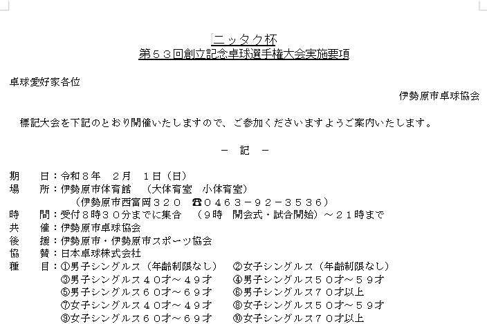 • 【ニッタク杯】第53回創立記念卓球選手権大会(開催日:R8年2月1日(日)、申込締切:1月4日(日))