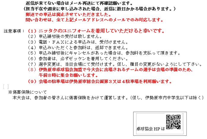 • 第17回伊勢原市混合ダブルス団体戦卓球大会(開催日:令和7年11月15日(土)、申込締切11月1日(土))