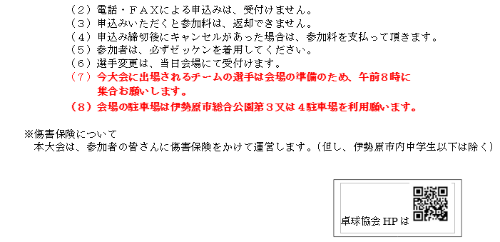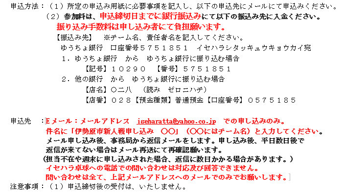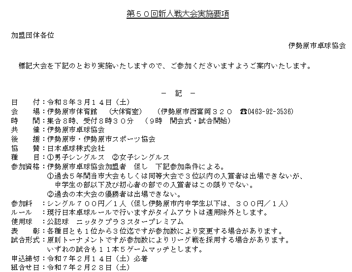 第50回新人戦大会実施要項(令和8年3月14日(土)) 2026年1月20日 最終更新日時 : 2026年1月20日 ishrtta EXCEL:第50回伊勢原市卓球新人戦申込書ダウンロード WORD:第50回新人戦卓球大会実施要項ダウンロード