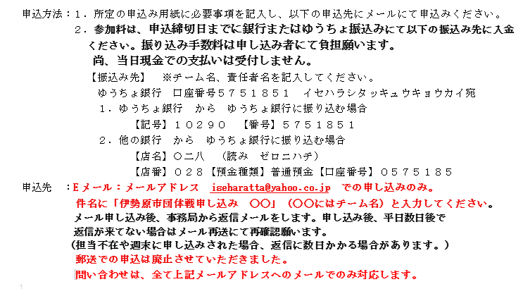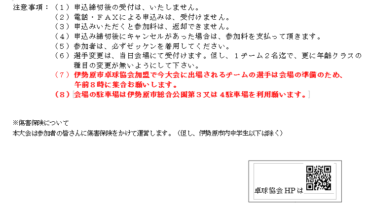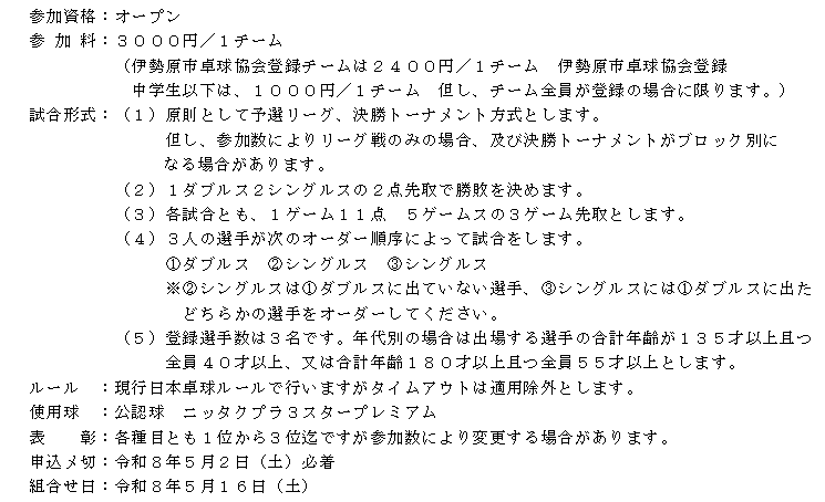 第11回伊勢原市団体戦卓球大会(5月30日(土))のお知らせ:申込は5月2日(土)迄 2026年3月12日 最終更新日時 : 2026年3月12日 ishrtta ◆以下の要項に基づき、第11回伊勢原市団体戦卓球大会を開催します。 エクセルの申込用紙を用いてお申し込み下さい。 EXCEL:第11回伊勢原市団体戦卓球大会申込書ダウンロード WORD:第11回伊勢原市団体戦卓球大会要綱ダウンロード . .
